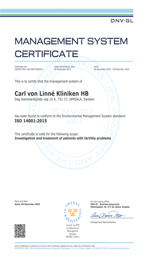 The clinic is also environmentally certified according to ISO 14001. Det Norske Veritas 2011-12-29 has issued a certificate 106293-2011-AE-ENG-SWEDAC. This means that in our daily routine work, we work to protect the environment.