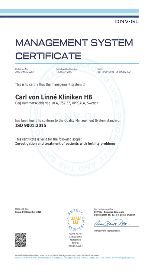 Quality and meticulous procedures are very important for success in IVF treatment. To obtain our goal of the highest possible quality, the clinic is certified according to ISO 9001. Det Norske Veritas (DNV) has audited and issued the certificate 2006-SKM-AQ-2282. Our certificate is for operations within "Investigation and Treatment of Patients with Fertility Problems". The clinic is audited regularly.